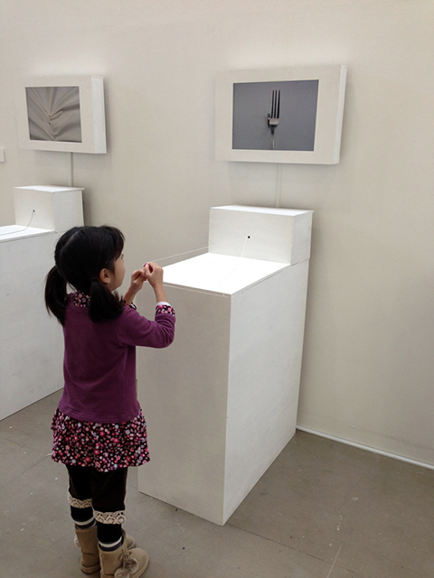フォークの映像の装置は4本の紐があり、映像のフォークの歯が4つのパターンに変形する。長いものと短いものが1本、他に2本、4本の歯が曲がり、歯の本数に同期して重さがどんどん重くなり、手元の感覚にリアリティが増していく。